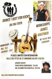 Le Samedi 06 Juin 2026, Journée Country avec Workshops de *Agnès Gauthier*, de 14h00 à 18h00 et Bal Country cd animé par *Christelle *, à 20h00, Salle d