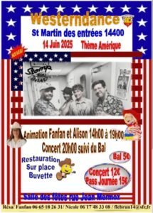 Le Samedi 14 Juin 2025, Journée sur le Thème Amerique animée par *Fanfan et Alison* de 14h00 à 19h00, avec Concert à 20h00 et Bal Country , Salle des Fetes, rue Jean Mer