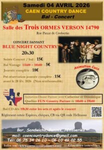 Concert des *Blue Night Country*, à 20h30, Chez *Caen Country Dance*, Salle des 3 Ormes, rue Pierre de Coubertin, à Verson (14790), Calvados.