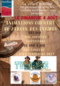 Le Dimanche 04 Aout 2024, Après Midi et Soirée Country dès 16h00, avec Bals, Initiations, Concert de *Turquoise Duet*, au Jardin des Carmes, à Aurillac (15), Cant