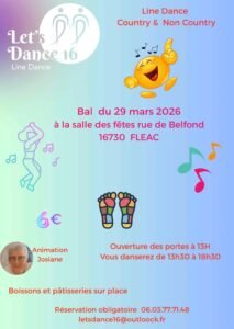Le Dimanche 29 Mars 2026, Après Midi Bal Line Dance Country et non Country chez *Let’s Dance 16*, animée par *Josiane*, de 13h30 à 18h30, Salle des Fêtes, rue de Belfond, à Fléac (1673