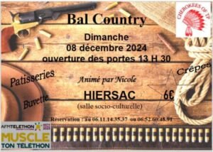 Le Dimanche 08 Décembre 2024, Après Midi Bal Country animé par *Nicole*, à 13h30, Salle Socio Culturelle de Hiersac (16290), Charente.