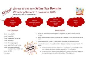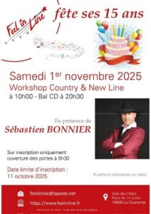 Le Samedi 1er Novembre 2025, Journée Country et New Line en Présence de *Sébastien Bonnier*, à partir de 10h00, avec Workshop et Bal cd à 20h30, Salle des Fetes, Place du 14 Juillet, à La Couronne (16400), Charente.