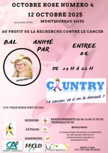 Le Dimanche 12 Octobre 2025, Après Midi Bal Country Rose, avec *Bernadette*, de 14h00 à 22h00, Salle des Fetes de Montmoreau (16190), Charente.