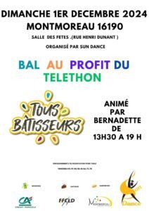 Le Dimanche 1er Décembre 2024, Après Midi Bal Country animée par *Bernadette*, au profit du Téléthon, chez *Sun Dance*, de 13h30 à 19h00, Salle des Fetes, rue Henri Dunant, à Montmorea
