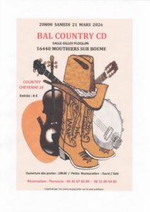 Le Samedi 21 Mars 2026, Bal Country cd chez *Country Cheyenne 16*, à 20h00, Salle Gilles Ploquin, à Mouthiers sur Boeme (16440), Charente.