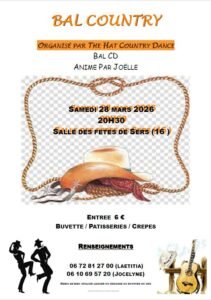 Le Samedi 28 Mars 2026, Bal Country cd animé par *Joëlle*, chez *The Hat Country Dance*, à 20h30, Salle des Fêtes de Sers (16), Charente.