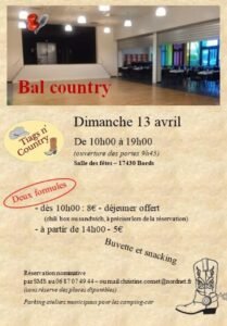 Le Dimanche 13 Avril 2025, Journée Country chez *Tiags n’ Country*, de 10h00 à 19h00, Salle des Fetes de Bords (17430), Charente Maritime.