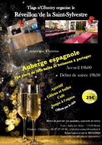Le Mardi 31 Décembre 2024, Soirée Reveillon Country des *Tiags n’Country*, animée par *Christine*, à 19h30, Salle des Fetes de Bords (17430), Charente Maritime.
