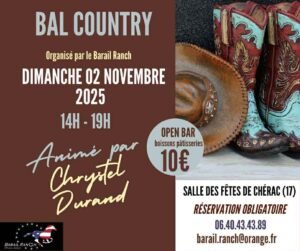 Le Dimanche 02 Novembre 2025, Après Midi Bal Country , animée par *Chrystel Durand* et organisé par *Le Barail Ranch*, de 14h00 à 19h00, Salle des Fetes de Chérac (17), Charente