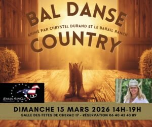 Le Dimanche 15 Mars 2026, Après Midi Bal Country animée par *Chrystel Durand et le Barail Ranch*, de 14h00 à 19h00, Salle des Fêtes de Cherac (17), Charente Maritime.