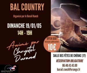 Le Dimanche 19 Janvier 2025, Après Midi Bal Country organisée par *Le Barail Ranch* et animée par *Chrystel Durand*, de 14h00 à 19h00, Salle des Fetes de Chérac (17), Char