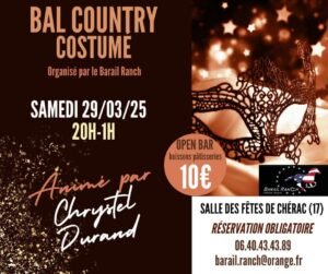 Le Samedi 29 Mars 2025, Bal Country Costumé, organisé par *Le Barail Ranch* et animé par *Chrytel Durand*, de 20h00 à 01h00, Salle des Fetes de Chérac (17), Charente Mariti