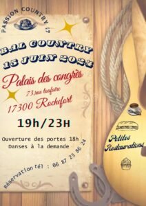 Le Samedi 15 Juin 2024, Bal Country chez *Passion Country*, de 19h00 à 23h00, Palais des Congrès, 73, rue Toufaire, à Rochefort (17300), Charente Maritime.