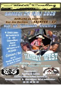 Le Samedi 24 Mai 2025, Bal avec Concert Country des *Yankey West*, à 21h00, précédé d’un Bal Country cd à 19h00, au Bowling, rue des Rochers, à Saintes (17) Charente M
