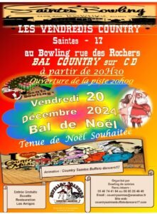 Le Vendredi 20 Décembre 2024, Bal Country cd des *Country Saintes Buffalo Dancers 17*, à 20h30, au Bowling, rue des Rochers, à Saintes (17), Charente Maritime.