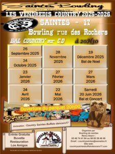Le Vendredi 28 Novembre 2025, Soirée Country des *Country Saintes Buffalo Dancers 17*, à 20h30, au Bowling, rue des Rochers, à Saintes (17100) , Charente Maritime.