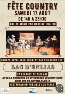 Le Samedi 17 Aout 2024, Journée Fete Country, de 14h00 à 23h30, avec Bal Country et Concert de *Apple Jack Country Band*, à 21h00, Lac D’Enlias, à St Georges de Didonne (17), Ch