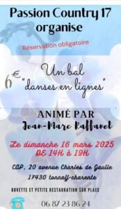 Le Dimanche 16 Mars 2025, Après Midi Bal Danses en Ligne animée par *Jean Marc Raffannel*, de 14h00 à 19h00, 20 Avenue Charles de Gaulle, à Tonnay Charente (17430),