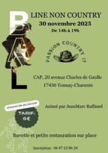 Le Dimanche 30 Novembre 2025, Après Midi Bal Line Dance des *Passion Country*, animée par *Jean Marc Raffanel*, de 14h00 à 19h00, Cap , 20 Avenue Charles de Gaulle, à Tonnay Charente (17430), C