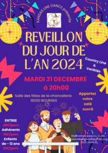 Le Mardi 31 Décembre 2024, Soirée Réveillon Country Line et Variétés , à 20h00, Salle des Fetes de la Chancellerie, à Bourges (18000), Cher.