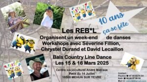 Les 15 et 16 Mars 2025, Week End Country Dance chez *Les Reb*L*, qui Feteront leurs 10 ans, avec des Workshops de *Séverine Fillion*, *Chrystel Durand* et *David Lecaillon*, des Bals Country et Line Dance, au Centre Socio Culturel André Malraux, Place du 14