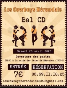 Le Samedi 25 Avril 2026, Bal Country cd des *Cowboys Nérondais*, à 19h30, Salle des Fetes de Nérondes (18350), Cher.