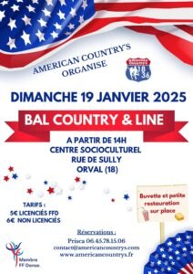 Le Dimanche 19 Janvier 2025, Après Midi Bal Country et Line des *American Country’s*, à 14h00, Centre Socioculturel, rue de Sully, à Orval (18), Cher.