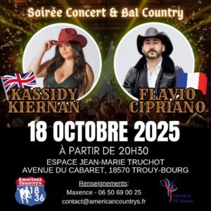 Le Samedi 18 Octobre 2025, Bal Country avec Concert chez *American Country 18 36*,avec *Kassidy Kierman* et *Flavio Cipriano*, à 20h30, Espace Jean Marie Truchot, Avenue du Cabaret