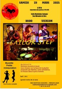 Le Samedi 29 Mars 2025, Soirée Country Music et Dance avec un Concert de *Sailor Step*, à 20h00, Salle Madeleine Sologne, rue Miranda de Ebro, à Vierzon (18100), Cher.