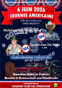 Le Samedi 06 Juin 2026, Journée Americaine chez *Country Club Val Dordogne*, avec Workshop de *Nikola Meyer*, à partir de 14h00 et Concert de *Eric Ward* à 20h00, S