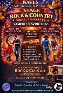 Le Samedi 18 Avril 2026, Journée Country avec Stage Rock et Country, à partir de 16h30 et Soirée animée par *DJ Mood Night* à 21h00, chez Country Corrèze et Nav’y Danse*, Salle Polyvalente de Pré Bourru, à Nav