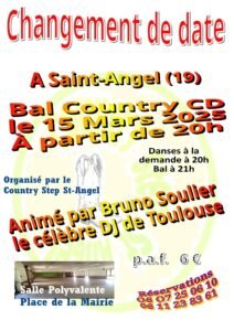 Le Samedi 15 Mars 2025, Bal Country à 21h00, animé par *DJ Bruno Soulier*, Chez *Country Step St Angel*, Salle Polyvalente, Place de la Mairie de St Angel (19), Correze.