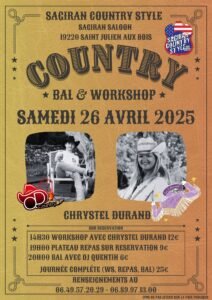 Le Samedi 26 Avril 2025, Journée Country à partir de 14h30, avec Workshop de *Chrystel Durand*, Plateau Repas, Bal Country animé par *DJ Quentin, à 20h00, chez *Sagiran Country Style*, Sagiran