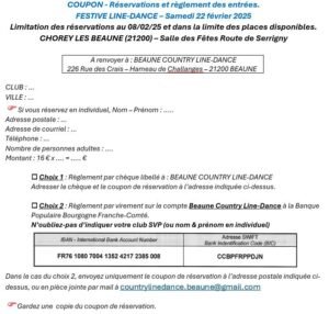 Accueil » Événements » (21) CHOREY LES BEAUNE / JOURNEE FESTIVE LINE DANCE LE 22.02.25.
