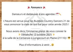 Le Dimanche 12 Octobre 2025, Bal Country des *Buddies Country Dancers*, Salle de la Ceriseraie, à Longecourt en Plaine (21110), Cote d’Or.