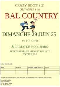 Le Dimanche 29 Juin 2025, Après Midi Bal Country chez *Crazy Boot’s 21*, de 14h00 à 19h00, à La MJC de Montbard (21500) Cote D’or.