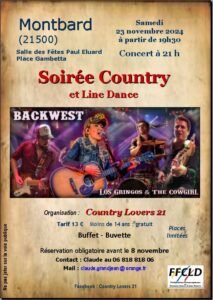 Le Samedi 23 Novembre 2024, Soirée Country et Line Dance des *Country Lovers 21*, , avec Concert des *Backwest*, à 21h00, Salle des Fetes Paul Eluard, Place Gambetta, à Montbard (2