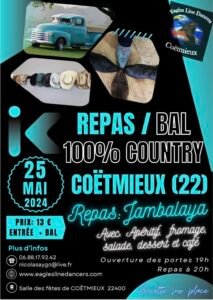 Le Samedi 25 Mai 2024, Repas et Bal 100% Country, à 20h00, Salle des Fetes de Coetmieux, (22400), Cotes D’Armor.