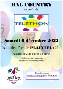 Le Samedi 06 Décembre 2025, Bal Country pour le Téléthon, chez *Color Hats Country Dancers*, à 20h00, Salle des Fetes de Plaintel (22), Cotes D’armor.