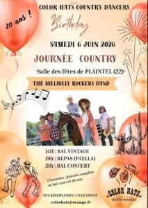 Le Samedi 06 Juin 2026, Journée Country des *Color Hats Country Dancers* qui Feteront leurs 20 ans, à partir de 14h00, avec Bal Vintage, Repas Paella, Bal Concert animé par *The Hillbilly Rockers Band* à 21h00, Salle des Fêtes de Plaintel (22), C