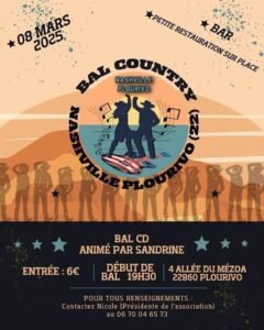 Le Samedi 08 Mars 2025, Bal Country cd animé par *Sandrine*, à 19h30, 04, Allée du Mézoa, à Plourivo (22860), Cotes D’armor.