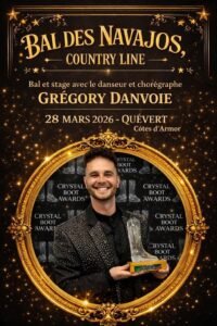 Le Samedi 28 Mars 2026, Bal Country et Line des *Navajos *animé par *Josy, Serge, Ludo, Morgane et Stécy*, avec *Gregory Danvoie*, Salle des Fêtes de Quévert (22), Côtes D’arm