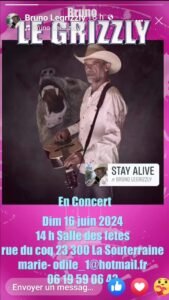 Le Dimanche 16 Juin 2024, Après Midi Country Music et Dance , avec un Concert de *Bruno le Grizzly*, à 14h00, Salle des Fetes, rue du Coq, à La Souterraine (23300), Creuse