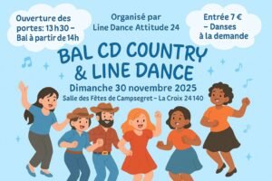 Le Dimanche 30 Novembre 2025, Après Midi Bal Country Line Dance cd, chez *Line Dance Attitude 24*, à 14h00, Salle des Fetes de Campsegret, à La Croix (24140), Dordogne.