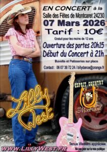 Le Samedi 07 Mars 2026, Soirée Country à 21h00, avec Concert de *Lilly West*, Salle des Fêtes de Montcaret (24230), Dordogne.