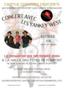 Le Dimanche 1er Décembre 2024, Après Midi Country Music et Dance chez *Castle Country Dancer’s*, avec un Concert des *Yankey West*, à 14h00, Salle des Fetes , 40, rue Edmont Rostand, à Po