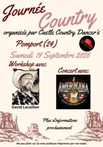 Le Samedi 19 Septembre 2026, Journée Country chez *Castle Country Dancer’s*, avec Workshop et Concert , à Pomport (24), Dordogne.