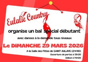 Le Dimanche 29 Mars 2026, Après Midi Bal Country Spécial Débutant chez *Eulalie Country*, à 14h00, Salle des Fêtes de St Aulaye (24410), Dordogne.
