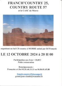 Le Samedi 12 Octobre 2024, *Franch’ Country 25, Country Route 57* et le CASC de Morre, organisent un Bal Country cd, animé par *DJ Francois*, à 20h00, à Morre (25660), Doubs.